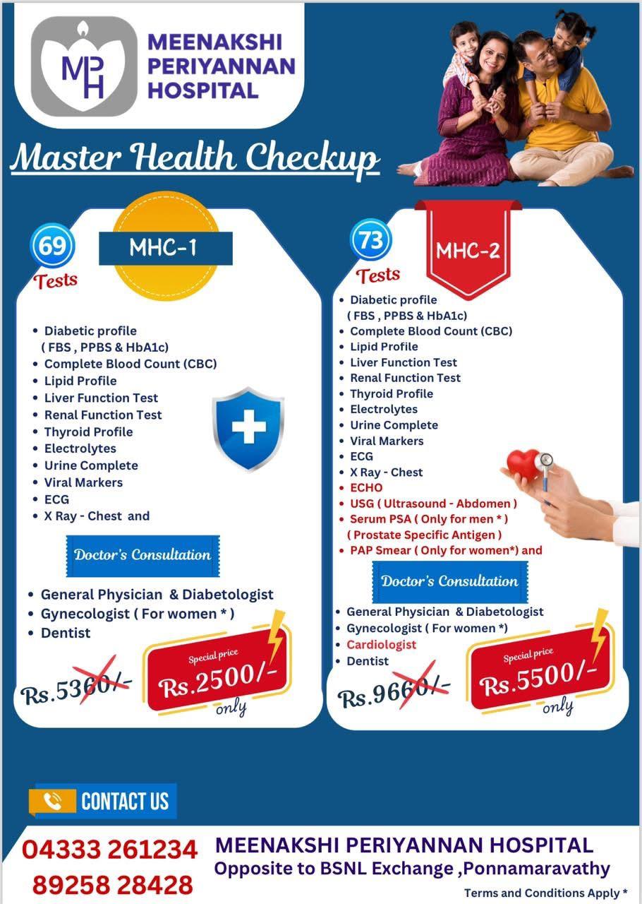 Meenakshi Periyannan Hospital, we believe prevention is the foundation of lifelong wellness. Our Master Health Checkup (MHC) packages are carefully designed to provide comprehensive, affordable, and convenient health screening for individuals and families.